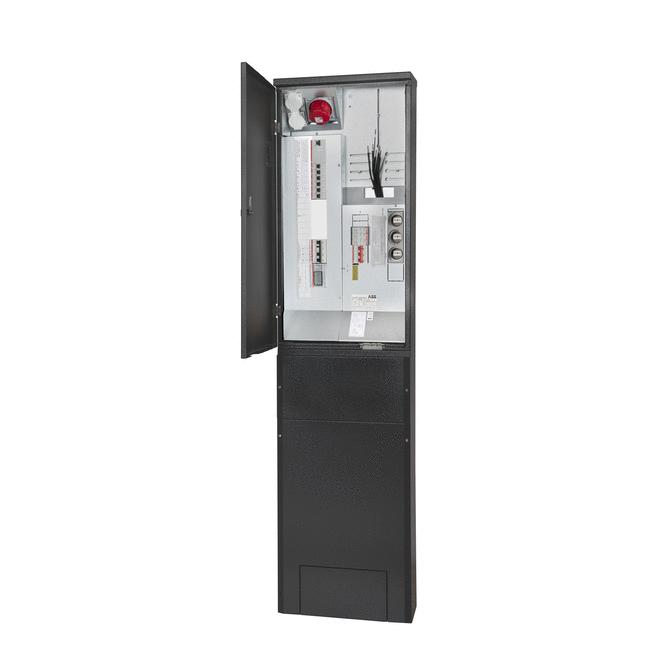 1-T mittauskeskus jalustalla 400x1600x170mm, VVSK suojatut pistorasiat: 2x116 ja 1x316. Kaukoluenta malli. Värisävy tumman harmaa, RAL7024, Ylijännitesuoja, 4-nap Vikavirtajohdonsuojakatkaisija sekä EV mittari sähköauton latausaseman syöttöä varten.