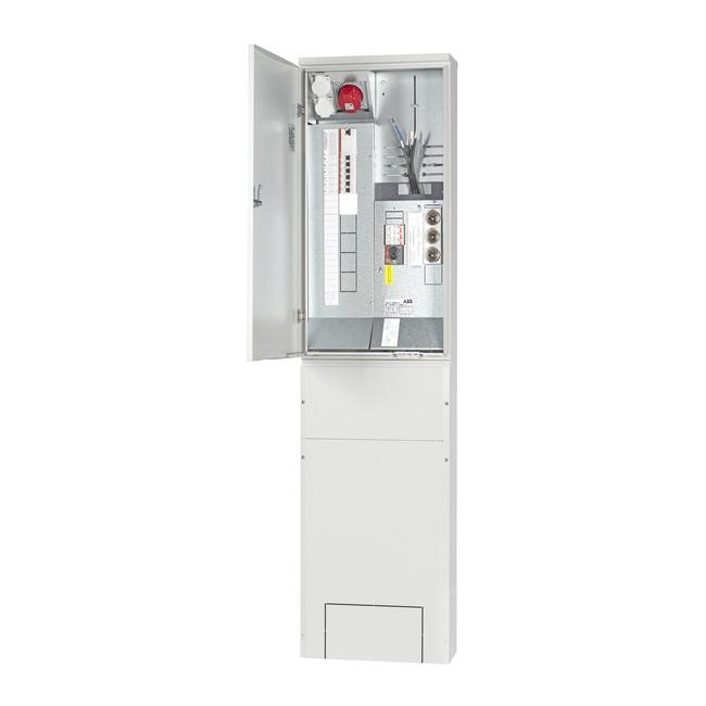 1-Tariffi mittauskeskus kiinteällä jalustalla 400 x 1600 x 170mm, pinta- ja uppoasennukseen. Vikavirtasuojatut pistorasiat, 2 kpl 116 ja 1 kpl 316. Kaukoluenta malli, pääkytkin on mittauksen jälkeen. keskuksessa T2-tason ylijännitesuoja. Värisävy vaalean harmaa, RAL7035. Syöttö Al 50 / Cu 50.