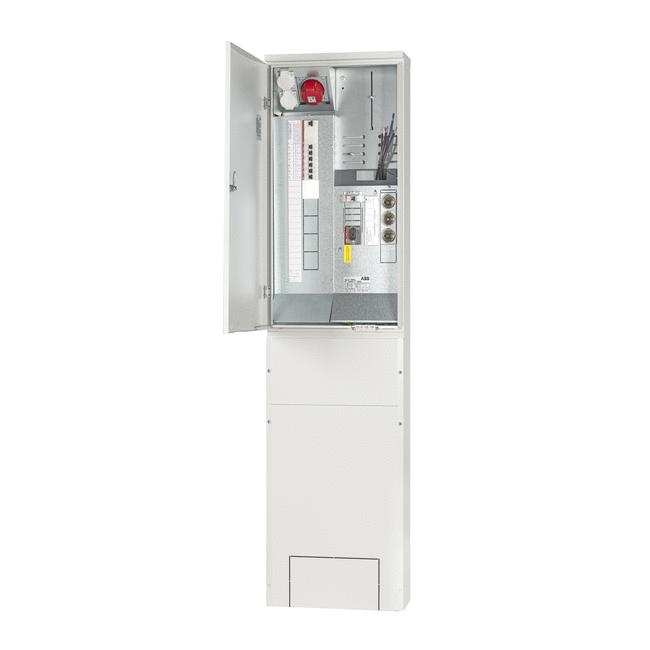 1-Tariffi mittauskeskus kiinteällä jalustalla 400 x 1600 x 170mm, pinta- ja uppoasennukseen. Vikavirtasuojatut pistorasiat, 2 kpl 116 ja 1 kpl 316. Kaukoluenta malli, pääkytkin on mittauksen jälkeen. Tilavaraus ylijännitesuojille. Värisävy vaalean harmaa, RAL7035. Syöttö Al 50 / Cu 50.