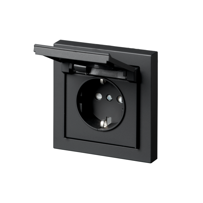 Uppoasennettava roiskevesitiivis pistorasia. Pistorasiassa on liittimet kahdelle johdolle kutakin kosketinta kohden. Ei lisäliittimiä. Liittimet on hyväksytty ML- ja MK-johtimille. IP44 hyväksytty läppäkansi ylös päin auki asennettuna. Läppäkansi on varustettu jousimekanismilla.