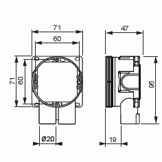Rasiassa on 2 kpl kiintonysiä Ø 20-putkelle. Rasian muilla sivuilla on yhteensä kolme irtonysäaihiota ja pohjaan voidaan liittää kaksi pohjanysää. Valmistettu halogeenittomasta materiaalista (IEC/61249-2-21) ja täyttää hehkulankatestin vaatimukset standardin IEC/EN60670: 2005 (850 °C) mukaan.