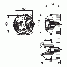 Teleskooppisen pohjan ansiosta rasian korkeus on 54 - 70 mm. Asennusreiän halkaisija Ø73-74 mm (normaali rasiapora).