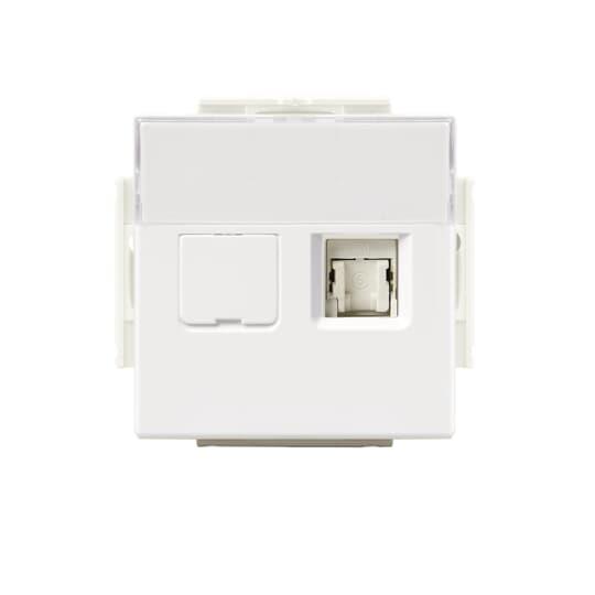Telerasia kahdella RJ45 suojaamattomalla liittimellä. Liittimet ovat Keystone kiinnitteisiä RJ45 Cat6 UTP (Valmistaja 3M). Liittimissä on kiinteä pölysuoja ja liittämiseen ei tarvita erikoistyökalua. Kaluste sopii 85mm Impressivo-peitelevyihin. Toimitukseen sisältyy sulkutulppa käyttämättömän liitinaukon peittämiseen.