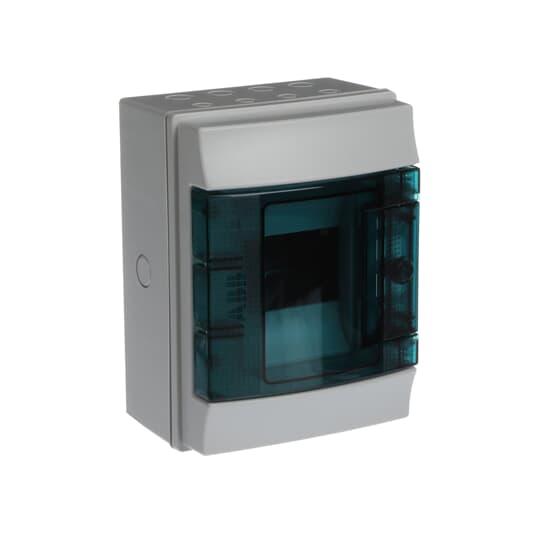 Moduulikotelo, 1 rivi, 4 moduulia. Läpinäkyvä petroolin sininen ovi.