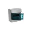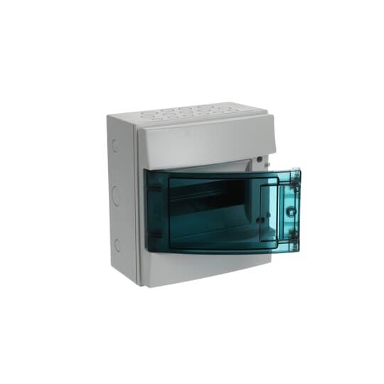 Moduulikotelo, 1 rivi, 8 moduulia. Läpinäkyvä petroolin sininen ovi.