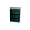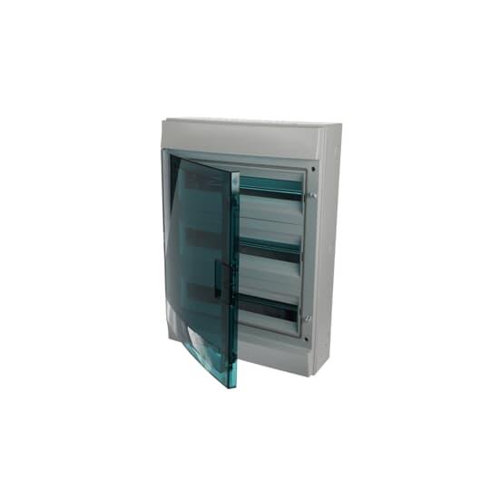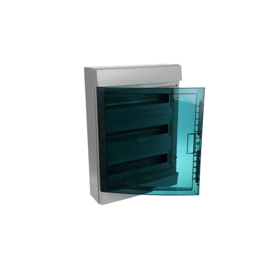 Moduulikotelo, 3 riviä, 54 moduulia. Läpinäkyvä petroolin sininen ovi.