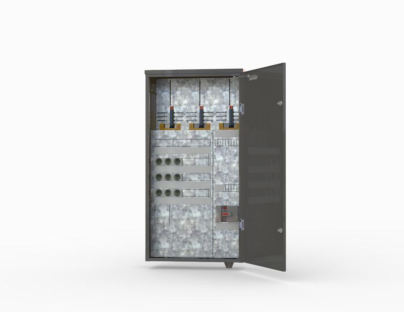 Kolmen mittaripaikan paritalokeskus 620x1200x260mm, jossa on asennettuna tyyppi 2:n ylijännitesuojat sekä omakäyttömittaus.