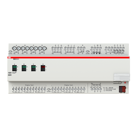 Huoneohjain RM/S2.1 soveltuu esim. huoneiston tai hotellihuoneen toimintojen ohjaamiseen. Huoneohjaimessa on 18 kpl potentiaalivapaita binäärituloja, 13 kpl relelähtöjä, 1 verhonohjauslähtöä, 3 puhallinlähtöä ja 4 venttiilienohjauslähtöjä.