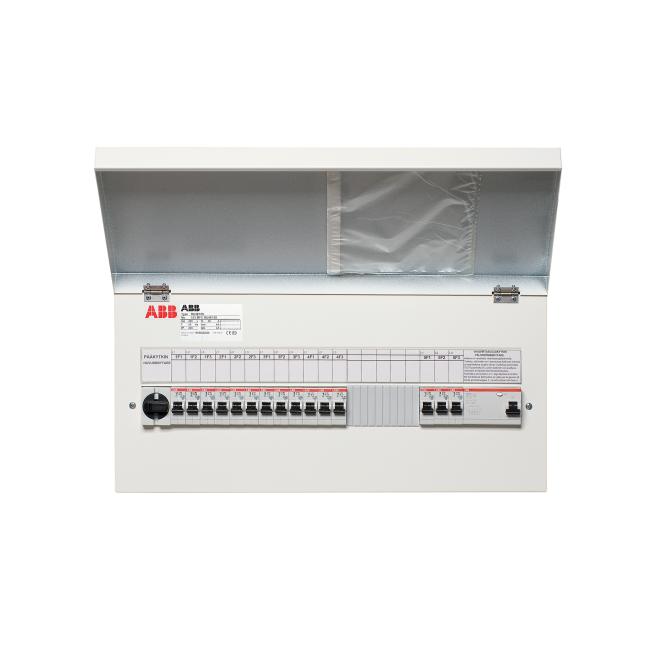 1kpl 40A 4-napainen vikavirtasuojakytkin. 15kpl jousiliitäntäistä johdonsuojakatkaisijaa. 5-moduulia varatilaa. Keskuksen mitat: 525x240x95mm, upotuskotelo 505x200x51 (upotussyvyys 52mm). Sisältää oven ja upotuskotelon, värisävy RAL9010.