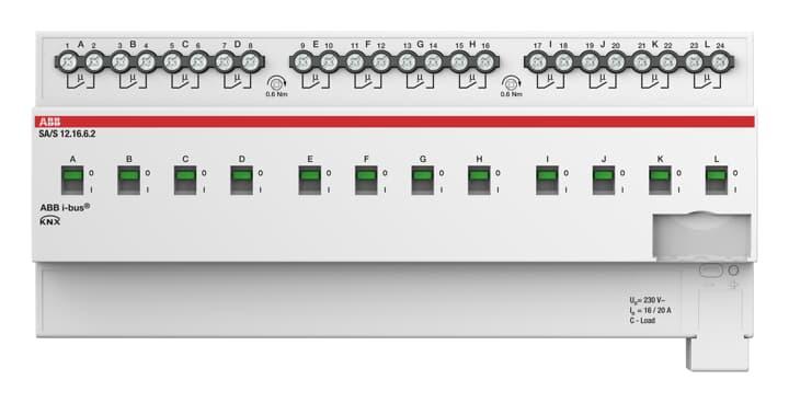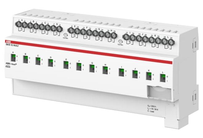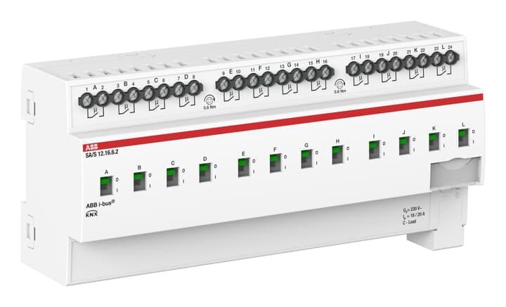 12-kanavainen kytkinyksikkö virranmittauksella, lähtöjen virrankesto 16A (AX, AC-3). Jokaisella kanavalla erikseen ohjelmoitavat laajat toiminnot esim. toiminta NO/NC valittavissa, veto-/päästöviive, logiikkatoiminnot sekä porrasvaloautomaattitoiminto. Lähtöjen tilatiedon indikointi ja käsi-ohjaus. Käyttöjännite KNX-väylästä.