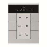 Huonetermostaatti LCD-näytöllä lämmityksen ja jäähdytyksen ohjaukseen, RGB-merkkivalolla, lämpötila-anturilla ja väyläliitynnällä. Painiketaulussa linssillinen merkintäkenttä. Asennus kojerasian päälle tai pintaan käyttäen pinta-asennuskehystä.